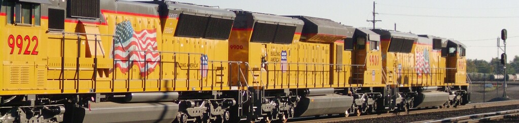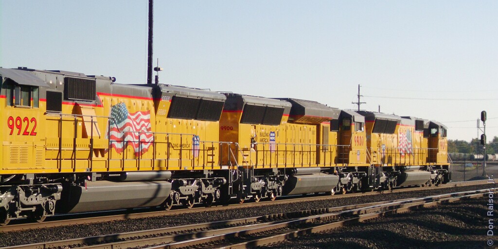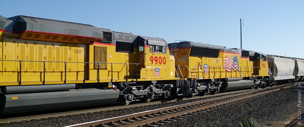 Along with UP9922 (not pictured) UP9900 and UP9921 push a local into the yard. UP9900 is an experimental, emissions reducing testbed.