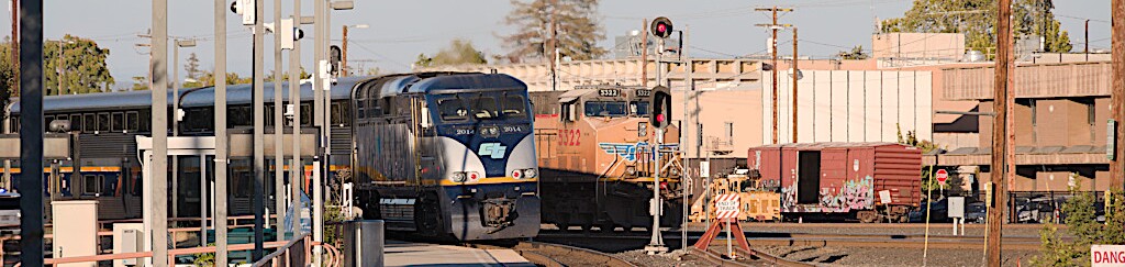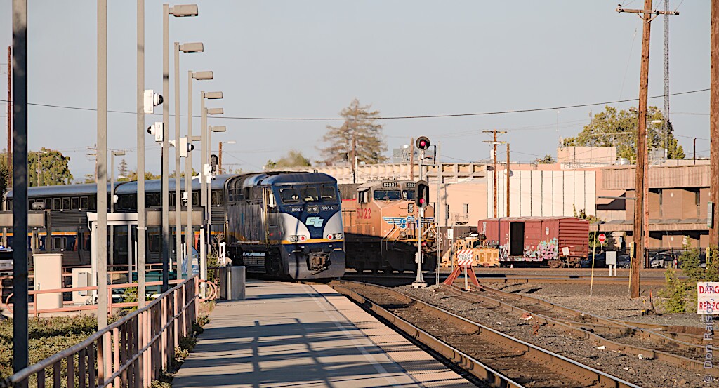 Amtrak California's Capitol Corridor 538 and a light power move were pacing each other for about four seconds as they headed east. (Away from the camera.) Then 538 accelerated away while the light power was probably setting up to head to the house.