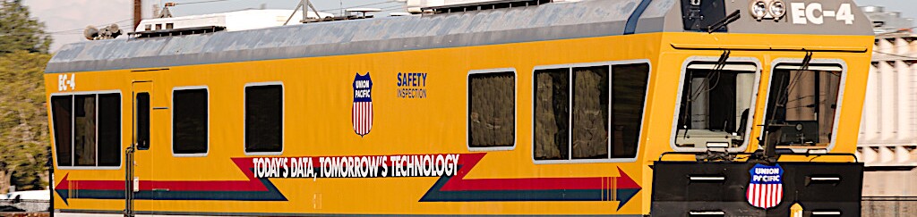 UP2612 is about to diverge onto the Valley Subdivision with Track Inspection Vehicle EC-4.