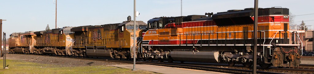Light power heading back into the yard to put UP1996 on the end of their train, it will be the DPU. The other three engines came back, went around the wye, and then went back down to the other end of the yard to couple up to front of their southbound train.