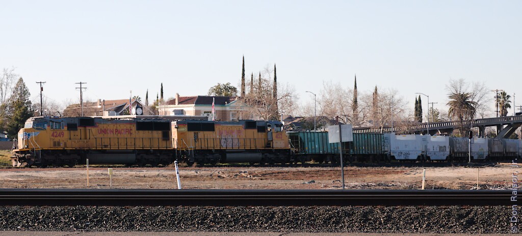 Photographs of locomotives, trains and other railroad equipment, mostly in the vicinity of the J. R. Davis Yard in Roseville California.