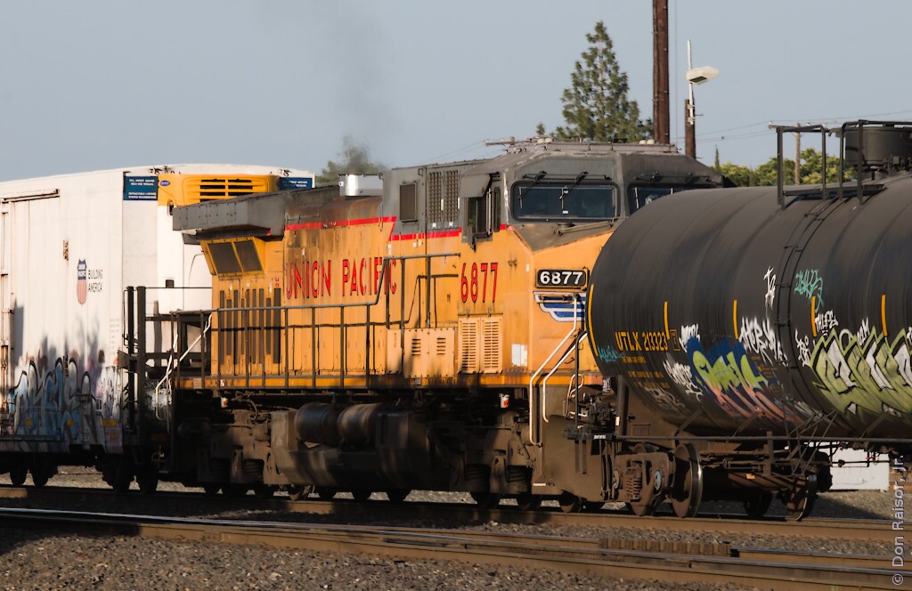 Photographs of locomotives, trains and other railroad equipment, mostly in the vicinity of the J. R. Davis Yard in Roseville California.