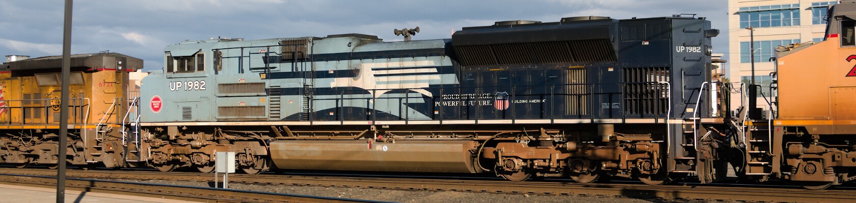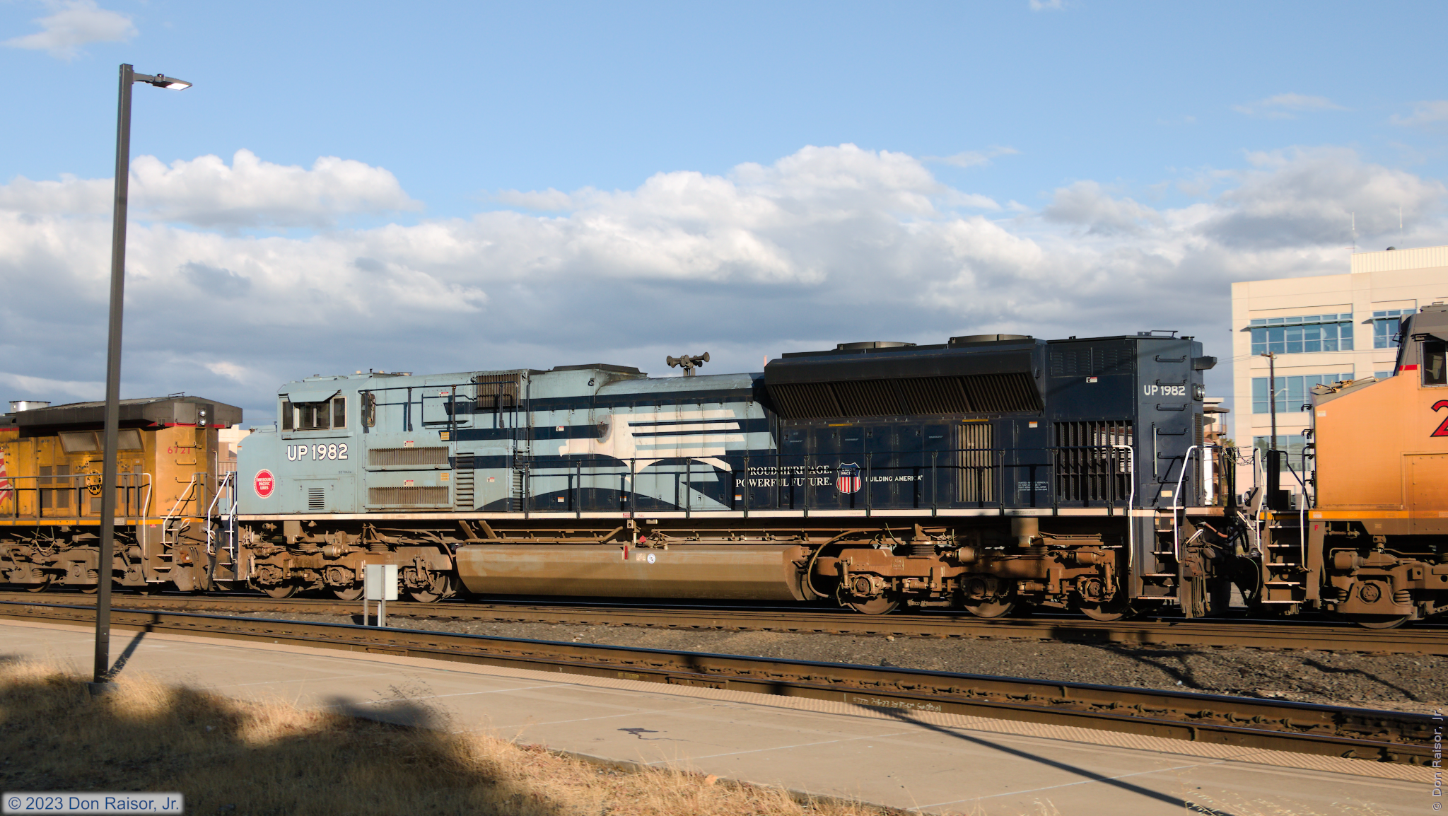 The heritage unit that represents fallen flag Missouri Pacific Lines is part of the light power move. (Previous photo.)