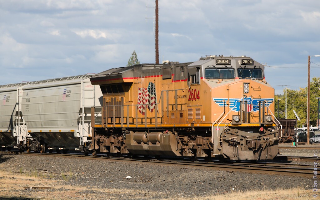 Here the grain train (previous photo) is crossing over from main track two to main track one. UP6318 is one of the few locomotives on the UP roster that is still wearing the Southern Pacific livery.