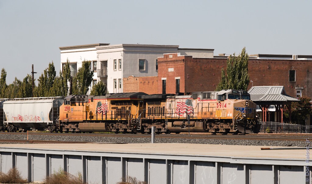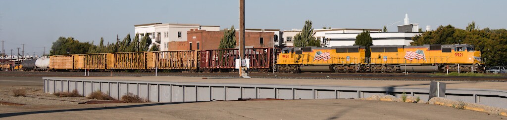 UP5914 is starting to lean as it leads an empty grain train onto the banked curve of the west branch of the wye (and onto the Valley Subdivision) on its way north to at least Binney Junction. Whether it continued north or diverged east from there… Well, your guess is as good as mine.