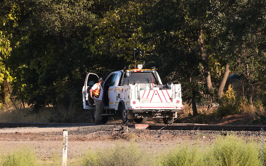 This hi-rail vehicle has been positioned on a railroad crossing so that its steel wheels can be lowered to the rails. A private access road on the east branch of the wye is being used.