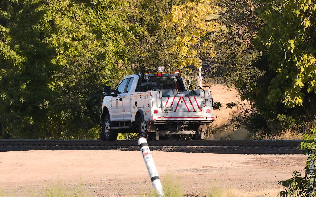 The hi-rail vehicle is on the rails and starting its journey, which will take it northward on the Valley Subdivision.