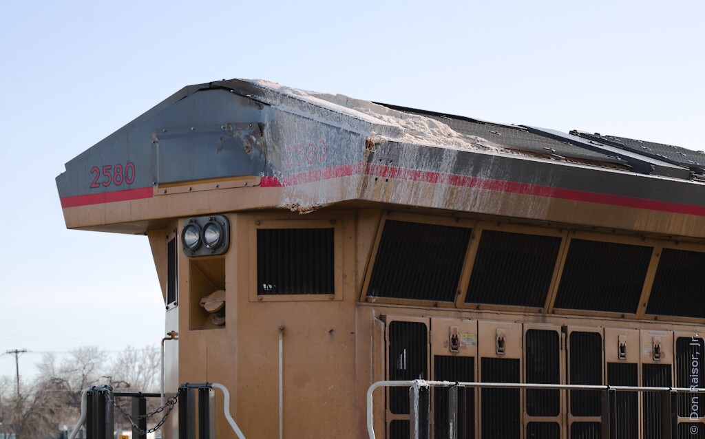 When I saw this locomotive come in on a gypsum train on February 16, 2024, I saw the gypsum on the radiator but, from where I was standing at the time, I could not see the damage that this engine had suffered.