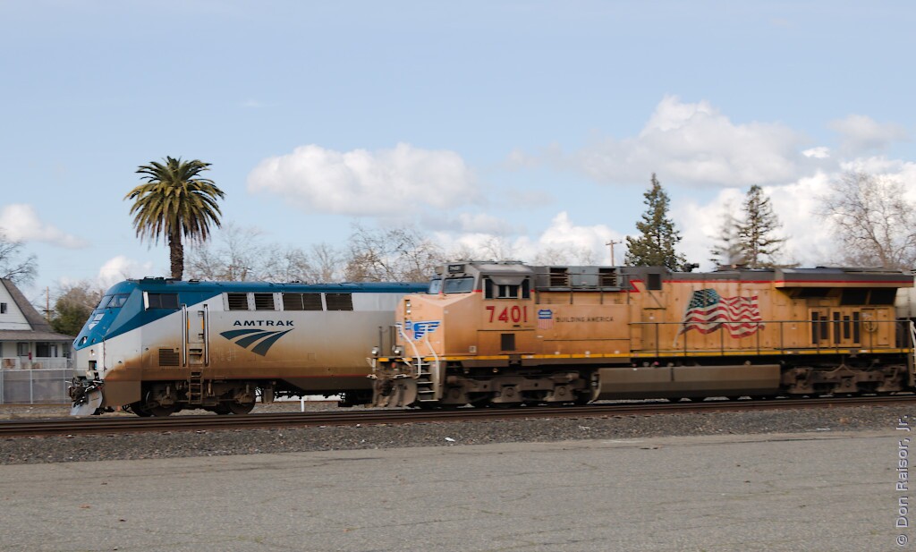California Zephyr number five arrived just as the end of the grain train passed by.