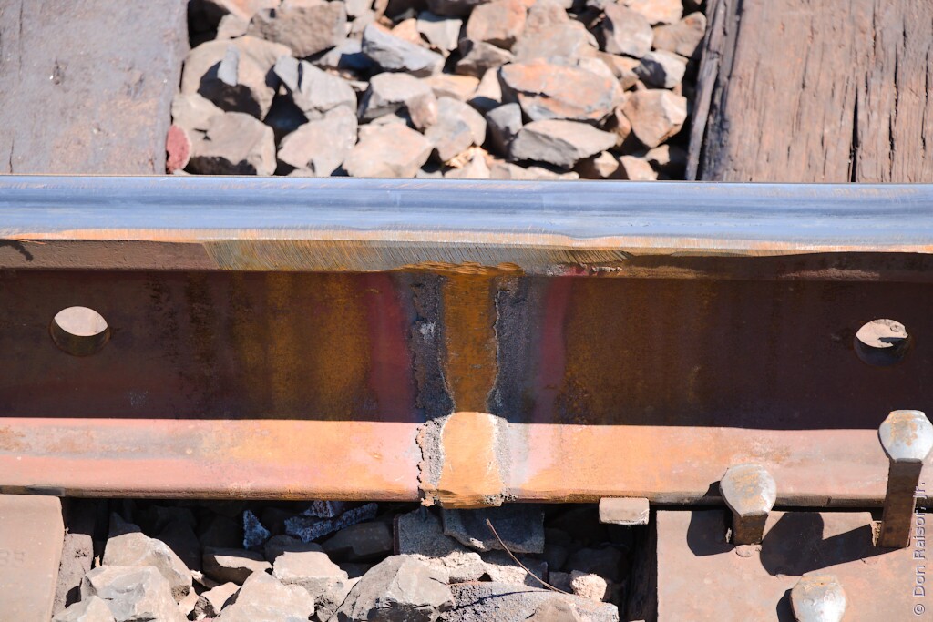 This almost month old thermite weld is on the same short piece of rail as the weld shown on the April 18, 2024 page, but on the opposite end of the rail. These welds replaced joint bars and bolts, and they can be seen from the train station platform.
