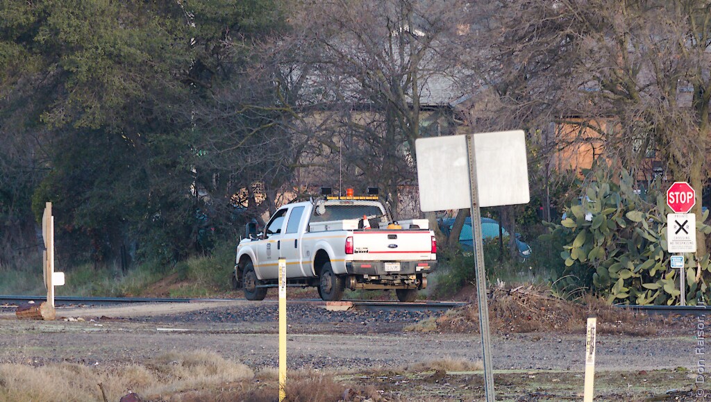 This hi-rail vehicle is about to lower its steel wheels to the rails and then head up the Valley Subdivision.