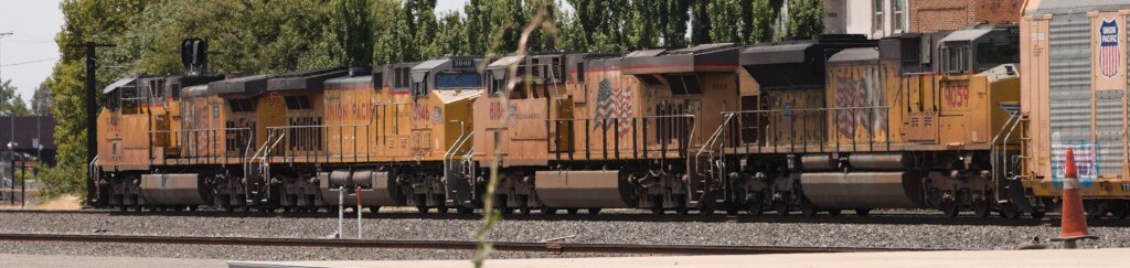 Four engines leading a train of empty auto racks into the yard.