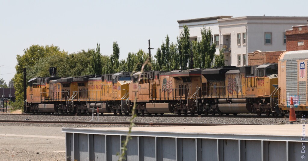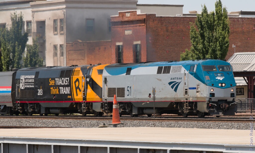 Due to equipment issues, California Zephyr number six was running over an hour late as it left Roseville with Amtrak's Operation Lifesaver fiftieth anniversary unit.