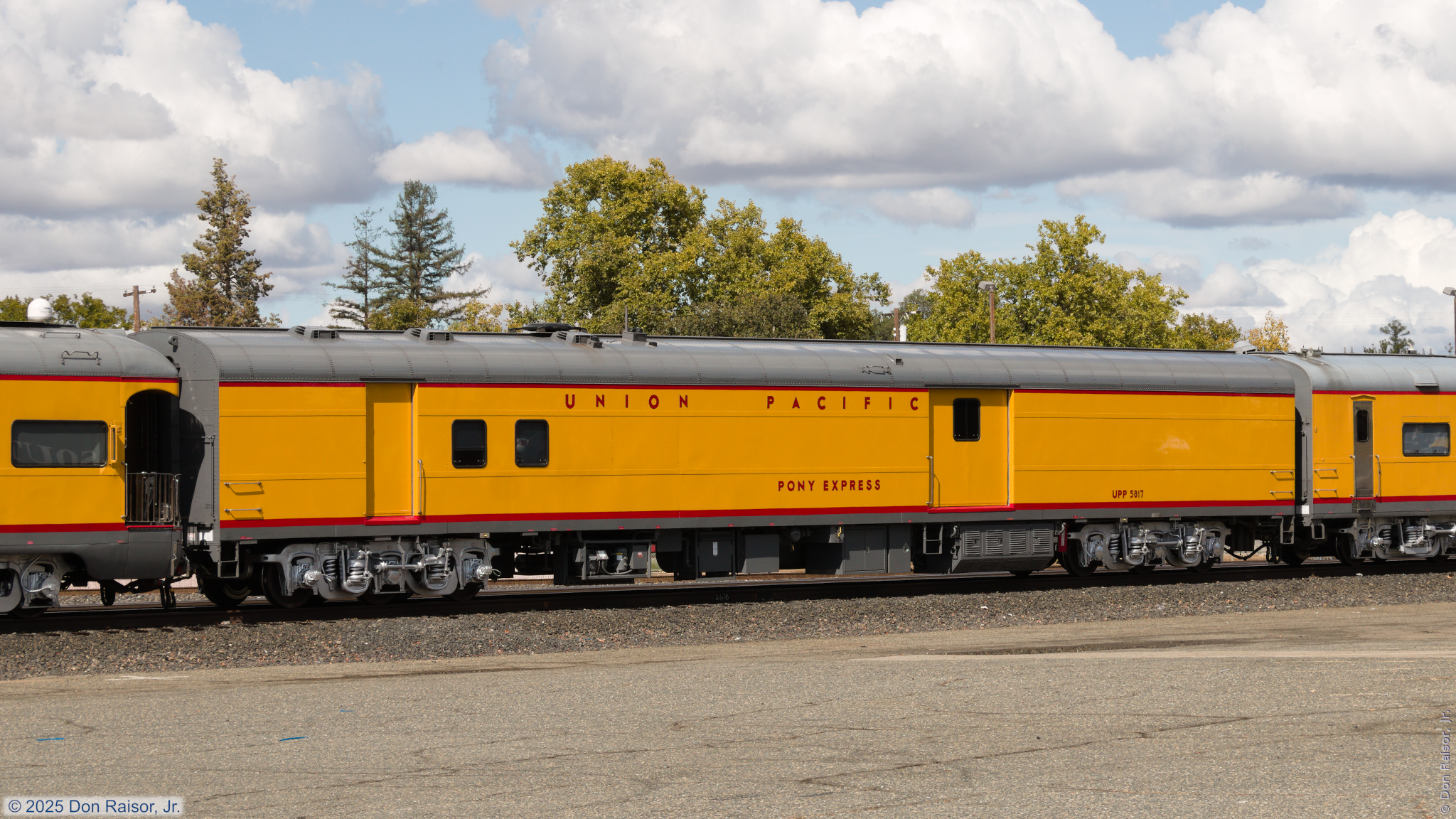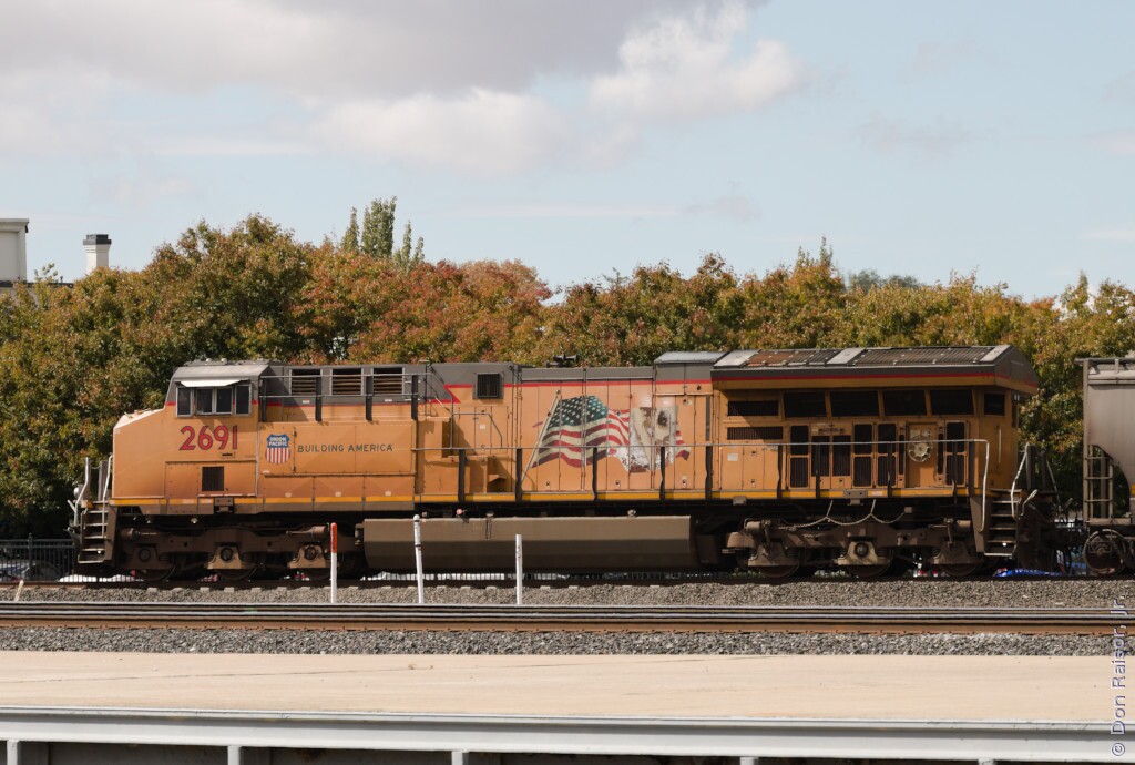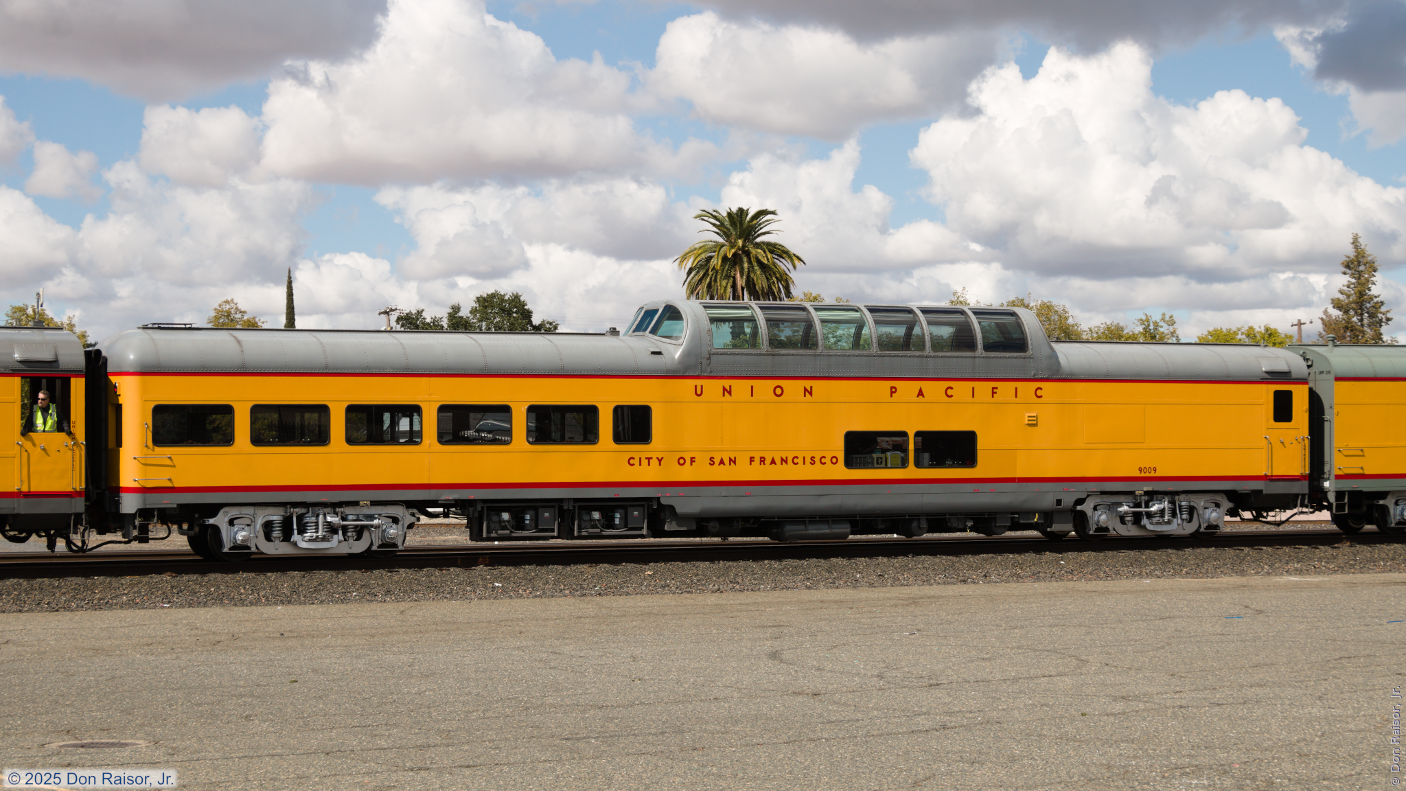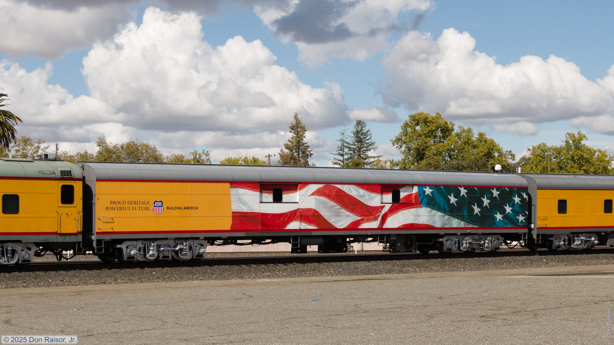 An E-train. (ESPRV) - California Zephyr number six with a single new ALC-42, which is unusual, these locomotives are typically delivered in pairs. - A Z-train. - A loaded grain train minus one engine. These trains usually have two leading locomotives and one rear DPU; this train only had one leading engine plus the rear DPU. - An officer car special (PSPRV) goes around the wye and eventually ties down on tracks 121 and 122. - California Zephyr number five with the phase IV heritage unit AMTK164. - A Z-train. - A mixed manifest. (MRVSP) - A mixed manifest and Capitol Corridor 538.