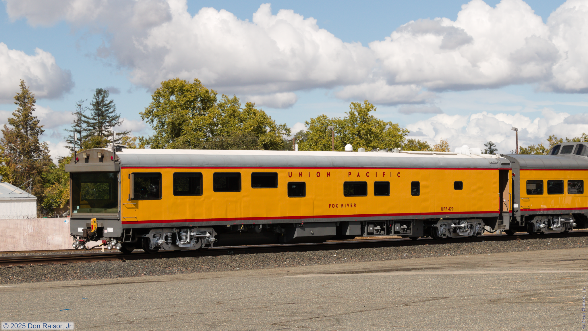 This officer car special (PSPRV) arrived from Sparks, Nevada then used the wye to turn around and is seen here shoving back from Tiger Way on track 121. Fox River is a track inspection car.