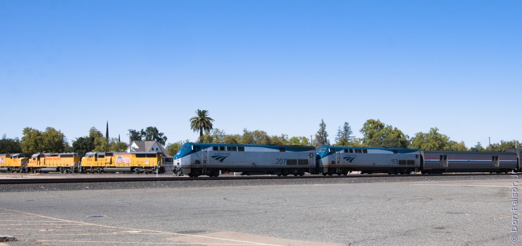 The Stockton Turn's power is waiting for Amtrak five to leave before heading to the house.